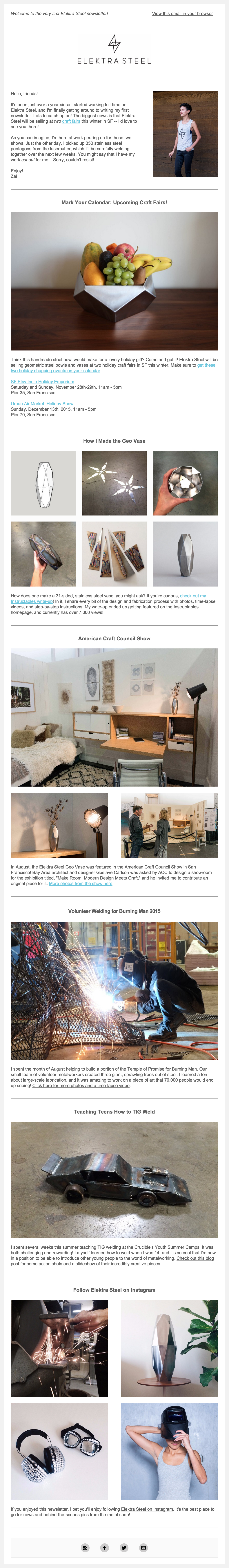 Well, it took me a year to get around to doing this, but I finally sent out the very first Elektra Steel newsletter! Take a peek below, and if you enjoy it, why not sign up to receive the next one in your inbox?
