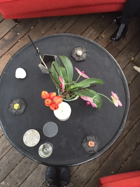 I'm kicking off the series with family friends Mary and Rob, who are some of my favorite repeat customers. Rob was my middle school math teacher, and their son was classmates with my little sister -- our families have known each other for a long time! Mary and Rob now have four Elektra Steel pieces: three Hex Votives and a Geo Planter. I love the way they've chosen to display and use these pieces! They're outside on a deck, surrounded by plants, flowers, beautiful votive candles, and, apparently, a glass of wine (#lifegoals, am I right?!).